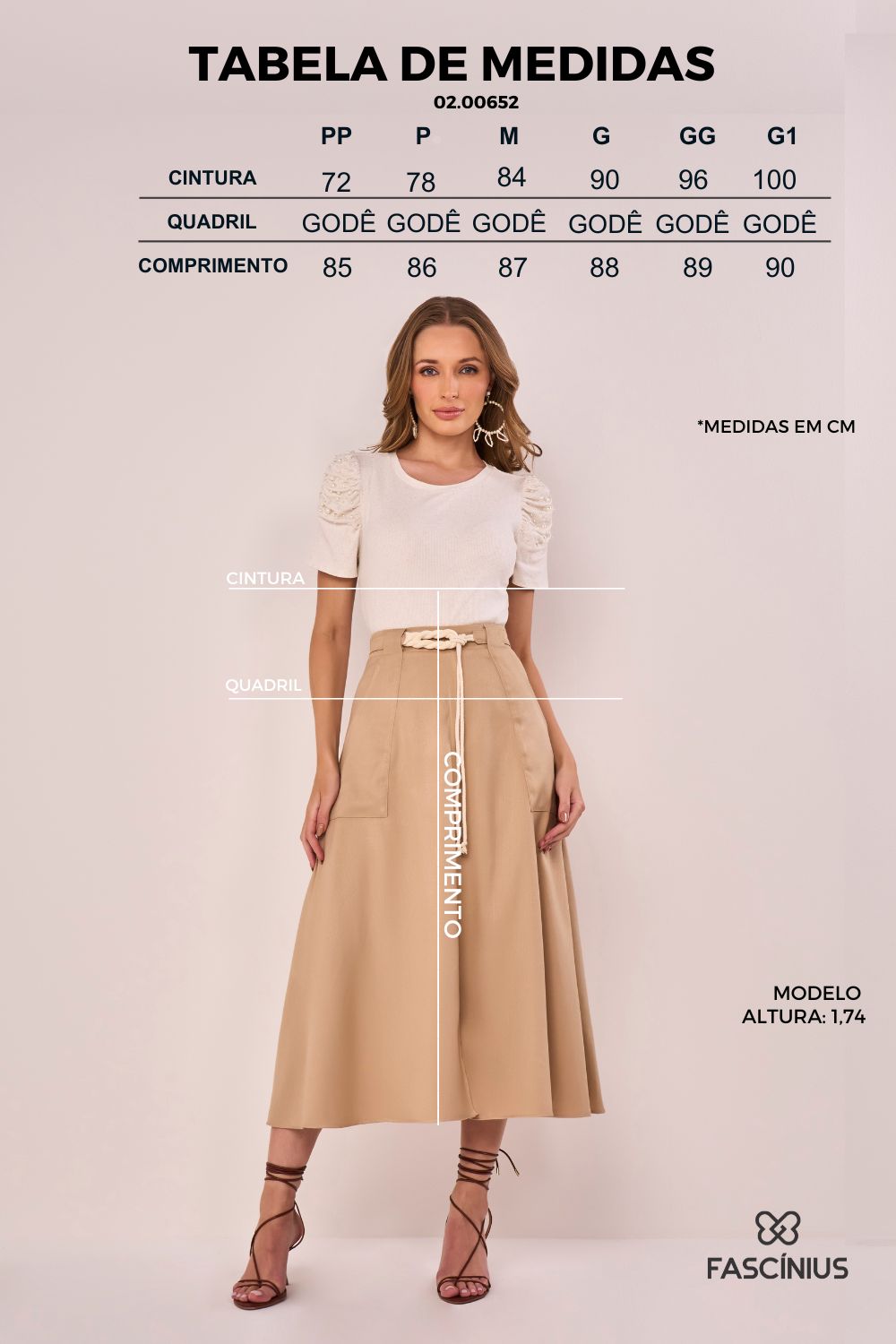 Saia midi godê perfeita para quem valoriza estilo e conforto. A amarração no cós e os bolsos funcionais garantem praticidade, enquanto a modelagem godê traz fluidez e movimento ao visual. Uma peça versátil para looks casuais e sofisticados!
